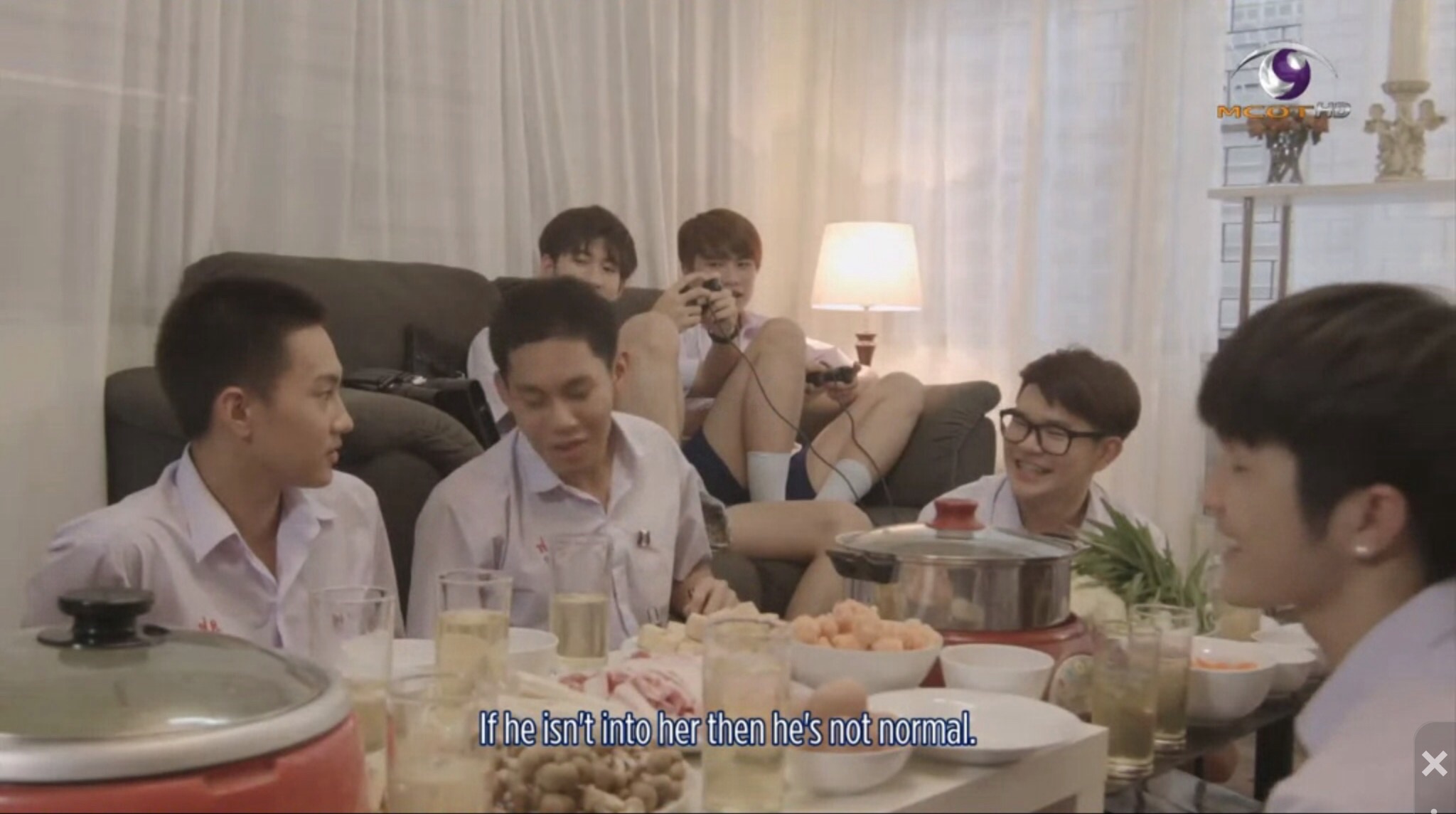 After he’s finished shopping with Yuri, Noh returns home to find that band club members and 11th grade classmates have taken over his house for a party he didn’t know about. P’Im let Ohm know that Noh’s parents were out of town and everyone is preparing food. The hot pot isn’t ready yet as everyone expected Noh to be home late from his date with Yuri and they begin to tease him about not being in the mood. Film chimes in that Ohm shouldn’t be teasing anyone and begins to tell everyone about Ohm’s “crush” on Mick. Ohm denies that the boys are anything more than “brothers.” When Noh joins in, the conversation shifts back to Noh and Phun, so Noh excuses himself to put beer away in the kitchen to avoid talking.