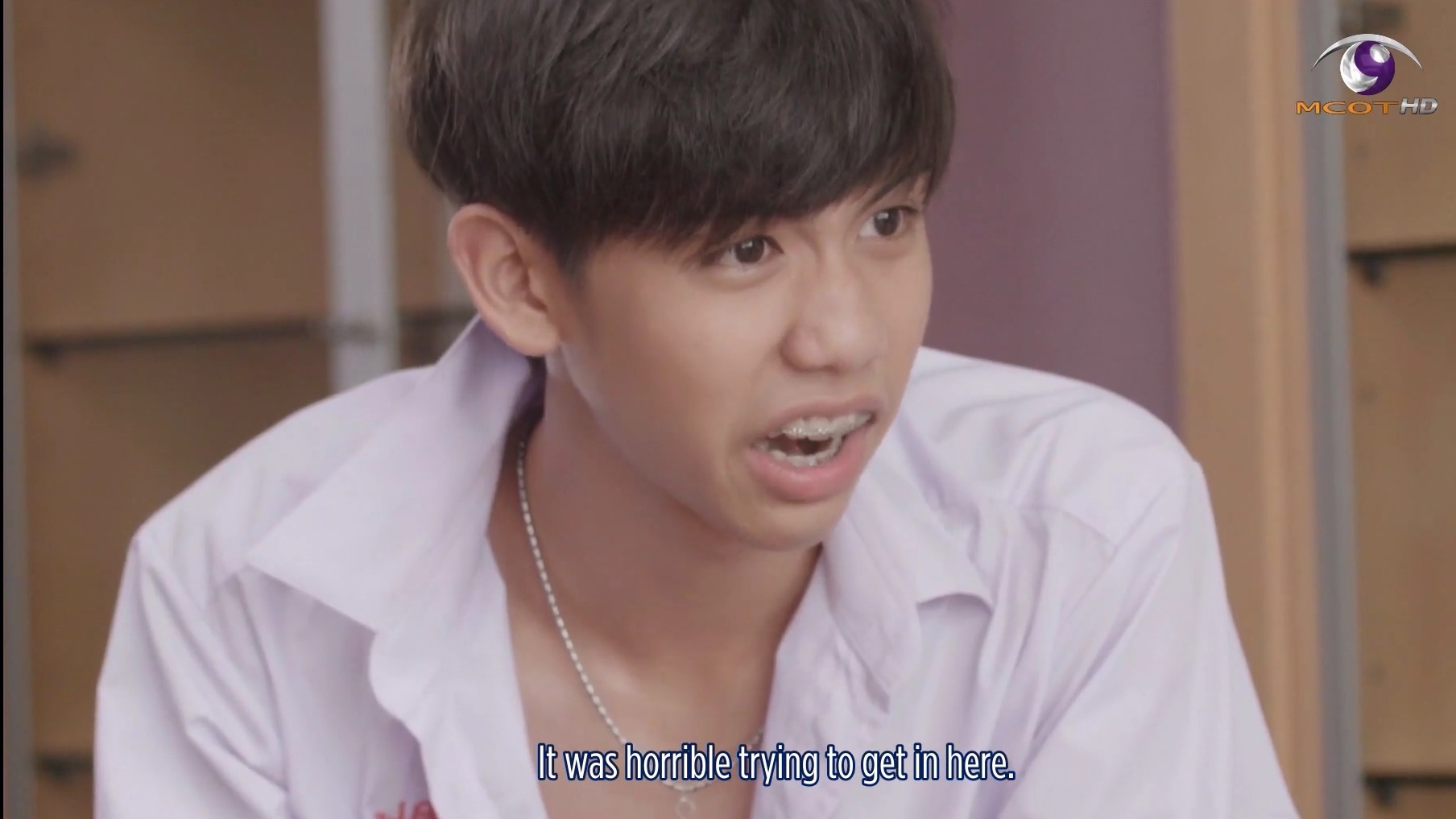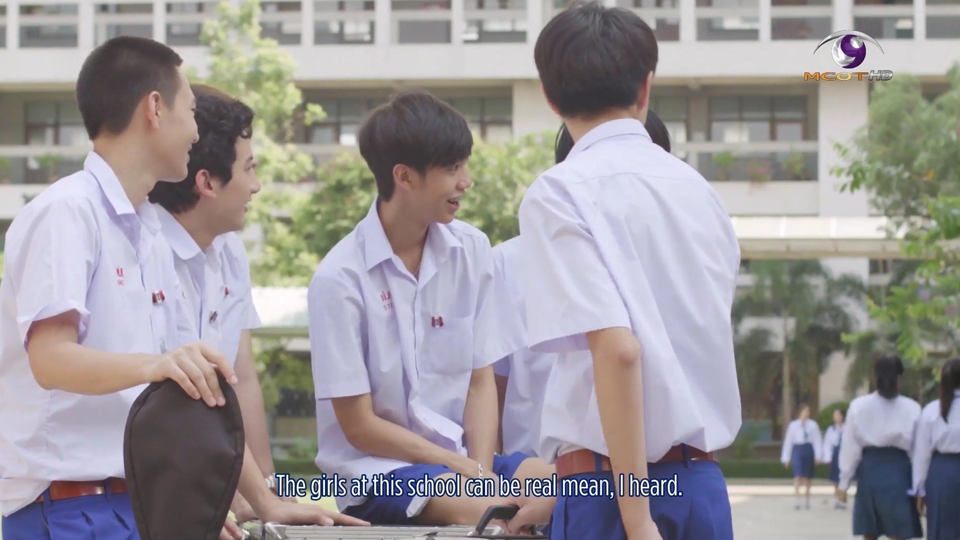 At the Convent, Noh and the band have gathered at the gates and note that there is a huge banner welcoming them. A gaggle of convent girls have gathered to honk at the boys, because even though they are supposedly across the street from Friday College and they ride in the same subway cars and walk the same streets each day, the convent girls have never seen the male of the human species up close before. Per and Knott leave to check out the girls. Win wants to know where Ohm is, but no one knows. Jeed introduces herself to Noh as the music club president and offers to take care of him for the day.